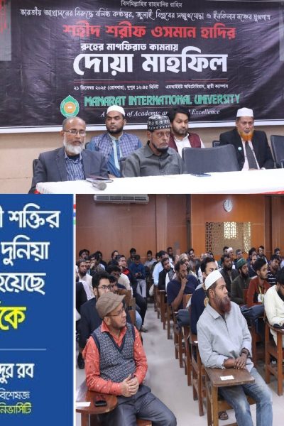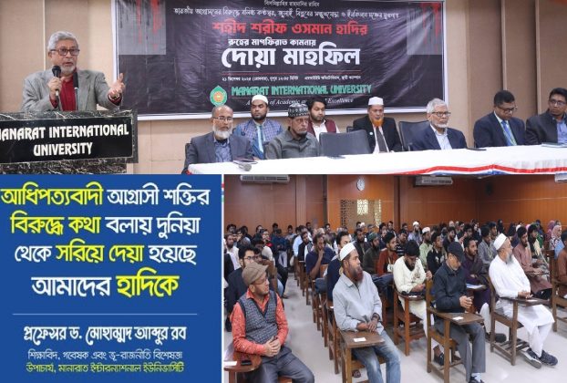 শহিদ শরীফ ওসমান হাদি বাংলাদেশকে এমন একটি আত্মমর্যাদাশীল, শক্তিশালী ও সার্বভৌম রাষ্ট্র হিসেবে গড়ে তুলতে চেয়েছিলেন—যেখানে কোনো আধিপত্যবাদী শক্তি আগ্রাসনের সাহস পাবে না। এই চেতনা জাগ্রত করায় তাঁকে দুনিয়া থেকে সরিয়ে দেওয়া হয়েছে বলে মন্তব্য করেছেন মানারাত ইন্টারন্যাশনাল ইউনিভার্সিটির ভাইস-চ্যান্সেলর প্রফেসর ড. মোহাম্মদ আবদুর রব। রোববার (২১ ডিসেম্বর ২০২৫) আশুলিয়ায় বিশ্ববিদ্যালয়ের স্থায়ী ক্যাম্পাসের অডিটোরিয়ামে ভারতীয় […]