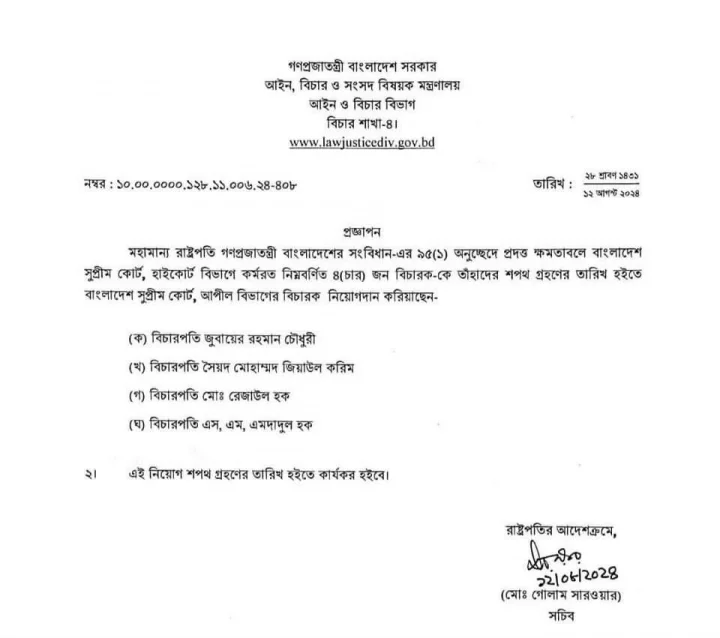 প্রজ্ঞাপনে বলা হয়েছে, ‘মহামান্য রাষ্ট্রপতি গণপ্রজাতন্ত্রী বাংলাদেশের সংবিধান-এর ৯৫(১) অনুচ্ছেদে প্রদত্ত ক্ষমতাবলে বাংলাদেশ সুপ্রিম কোর্ট, হাইকোর্ট বিভাগে কর্মরত চারজন বিচারককে তাদের শপথ গ্রহণের তারিখ হতে বাংলাদেশ সুপ্রিম কোর্ট, আপিল বিভাগের বিচারক নিয়োগদান করেছেন। এই নিয়োগ শপথ গ্রহণের তারিখ হতে কার্যকর হবে।’