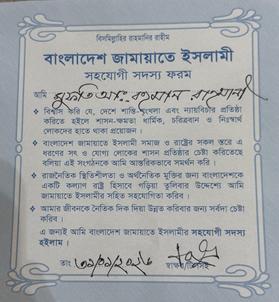 শনিবার (৩১ জানুয়ারি ২০২৬) দুপুরে বাংলাদেশ জামায়াতে ইসলামী ঢাকা মহানগরী দক্ষিণ কার্যালয়ে এসে তিনি জামায়াতে ইসলামীর সহযোগী সদস্য ফরম পূরণ করে দলটিতে যোগদান করেন।