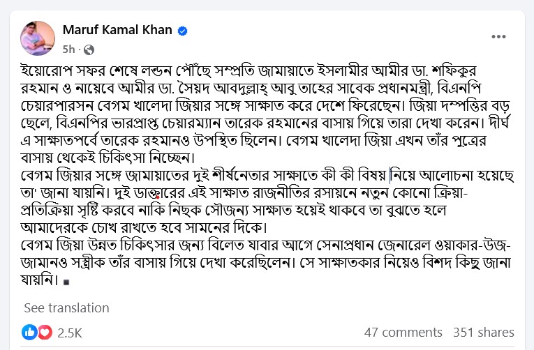 মারুফ কামাল খান লিখেছেন, ‘ইয়োরোপ সফর শেষে লন্ডন পৌঁছে সম্প্রতি জামায়াতে ইসলামীর আমীর ডা. শফিকুর রহমান ও নায়েবে আমীর ডা. সৈয়দ আবদুল্লাহ্‌ আবু তাহের সাবেক প্রধানমন্ত্রী, বিএনপি চেয়ারপারসন বেগম খালেদা জিয়ার সঙ্গে সাক্ষাত করে দেশে ফিরেছেন। জিয়া দম্পত্তির বড় ছেলে, বিএনপির ভারপ্রাপ্ত চেয়ারম্যান তারেক রহমানের বাসায় গিয়ে তারা দেখা করেন। দীর্ঘ এ সাক্ষাতপর্বে তারেক রহমানও উপস্থিত ছিলেন। বেগম খালেদা জিয়া এখন তাঁর পুত্রের বাসায় থেকেই চিকিৎসা নিচ্ছেন। বেগম জিয়ার সঙ্গে জামায়াতের দুই শীর্ষনেতার সাক্ষাতে কী কী বিষয় নিয়ে আলোচনা হয়েছে তা’ জানা যায়নি। দুই ডাক্তারের এই সাক্ষাত রাজনীতির রসায়নে নতুন কোনো ক্রিয়া-প্রতিক্রিয়া সৃষ্টি করবে নাকি নিছক সৌজন্য সাক্ষাত হয়েই থাকবে তা বুঝতে হলে আমাদেরকে চোখ রাখতে হবে সামনের দিকে। বেগম জিয়া উন্নত চিকিৎসার জন্য বিলেত যাবার আগে সেনাপ্রধান জেনারেল ওয়াকার-উজ-জামানও সস্ত্রীক তাঁর বাসায় গিয়ে দেখা করেছিলেন। সে সাক্ষাতকার নিয়েও বিশদ কিছু জানা যায়নি।’