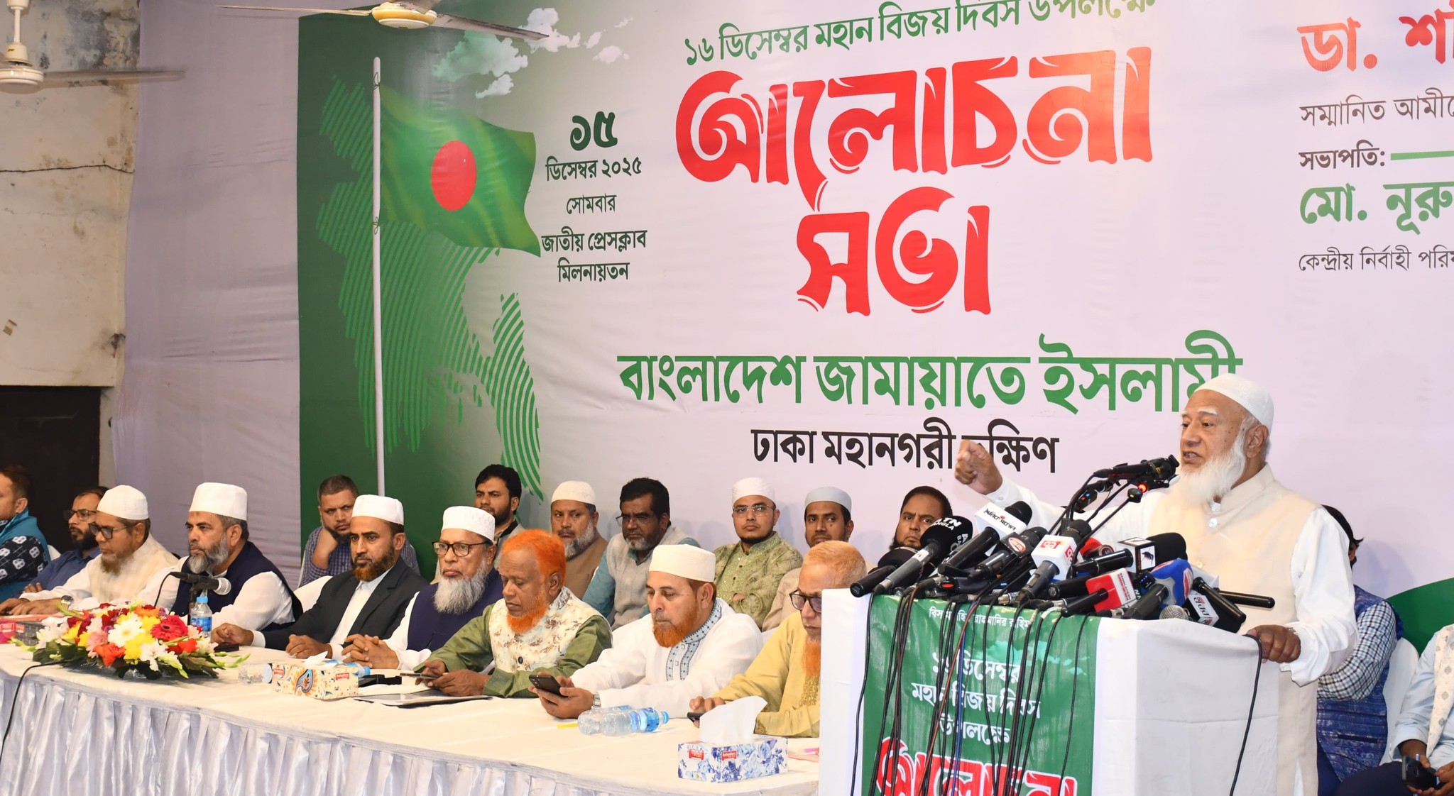 সোমবার (১৫ ডিসেম্বর ২০২৫) জাতীয় প্রেসক্লাব মিলনায়তনে বাংলাদেশ জামায়াতে ইসলামী ঢাকা মহানগরী দক্ষিণের উদ্যোগে আয়োজিত মহান বিজয় দিবস উপলক্ষে এক আলোচনা সভায় প্রধান অথিতির বক্তব্যে আমীরে জামায়াত জননেতা ডা. শফিকুর রহমান একথা বলেছেন।