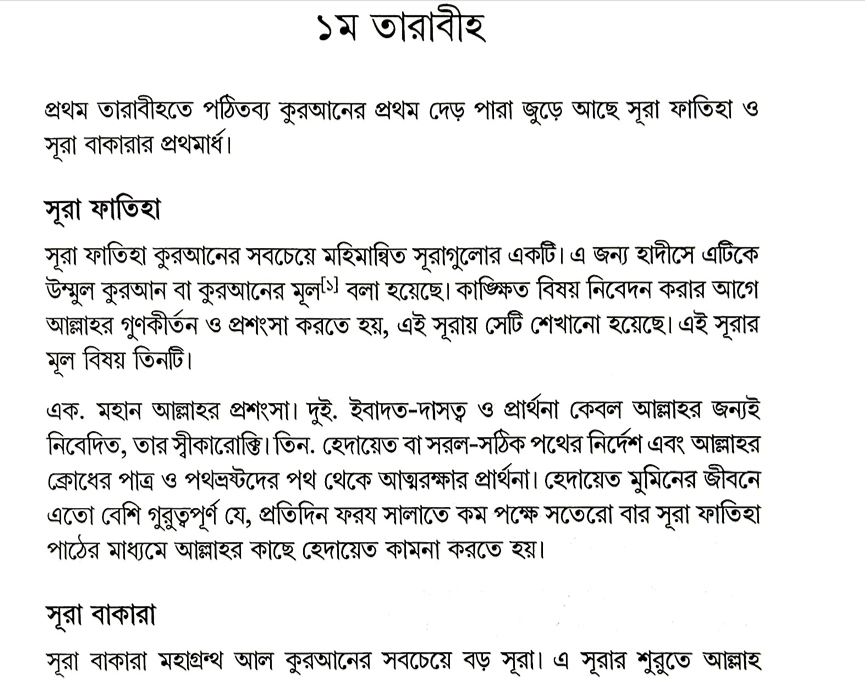 নামাজে কী তেলাওয়াত হচ্ছে বুঝতে পারেন বলেই তাদের কাছে তারাবীহর নামাজ উপভোগ্য। আমরা কীভাবে তারাবীহর নামাজ উপভোগ্য করতে পারি? আমরা তো আরবি বুঝতে পারি না! তাহলে তারাবীহর নামাজের সময়ে কোন দিন কি পড়ায় তা কিভাবে বুঝতে পারি?