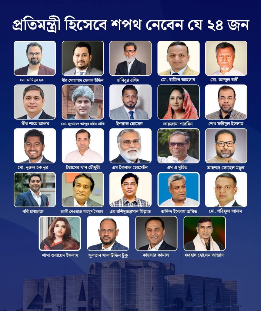 প্রধানমন্ত্রী তারেক রহমানের সঙ্গে নতুন মন্ত্রিপরিষদে ২৫ জন পূর্ণমন্ত্রী রাখা হয়েছে। তাদের মধ্যে একজন নারী এবং দু’জন টেকনোক্রেট মন্ত্রী রয়েছেন।