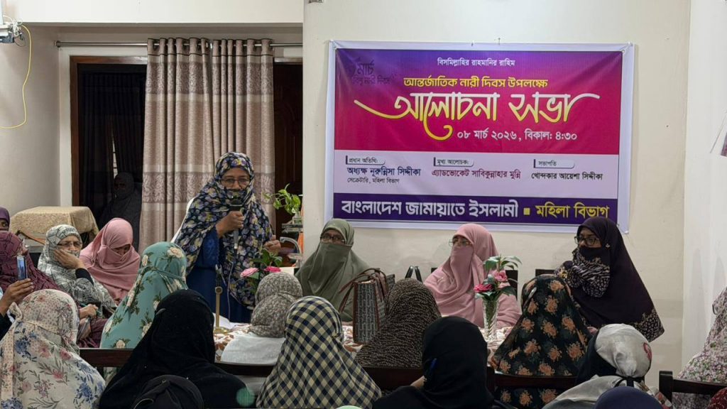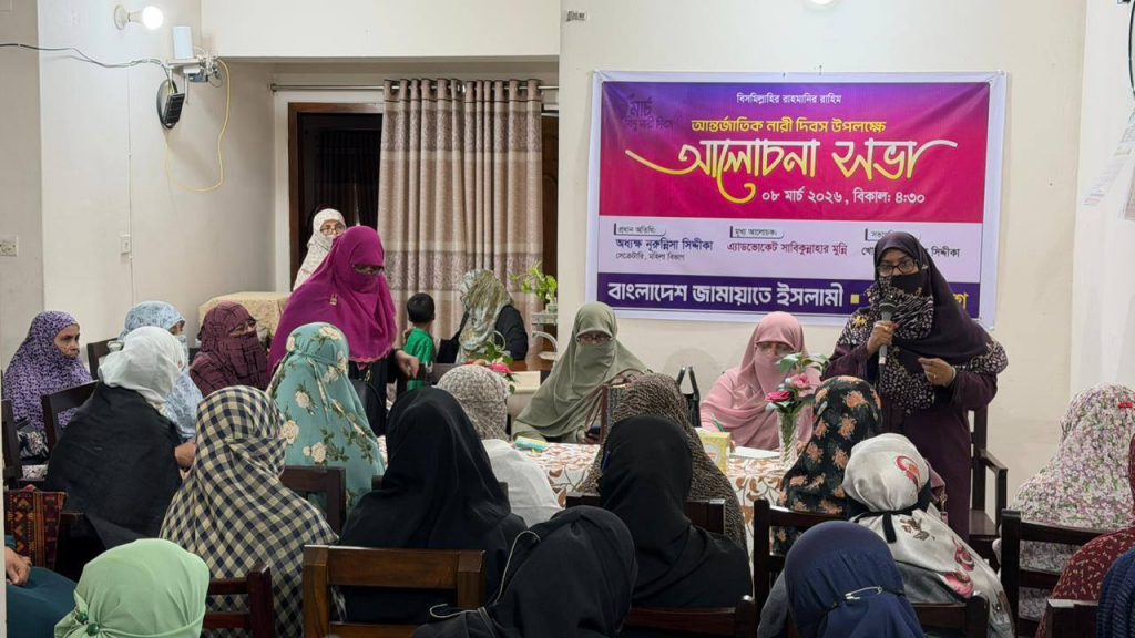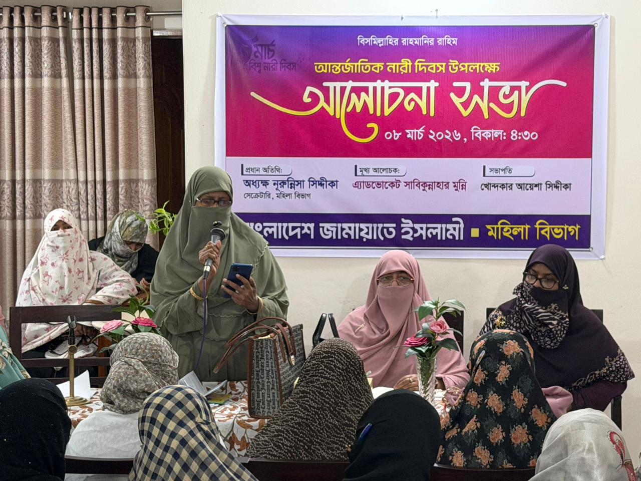 ৮ মার্চ রোববার বিকেলে রাজধানীর মগবাজারে আয়োজিত আলোচনা সভায় সভাপতিত্ব করেন কেন্দ্রীয় কর্মপরিষদ সদস্য সমাজ কল্যাণ বিভাগীয় সেক্রেটারি খন্দকার আয়েশা সিদ্দিকা। আলোচনা সভায় উদ্বোধনী বক্তব্য রাখেন কেন্দ্রীয় কর্মপরিষদ সদস্য তালিমুল কুরআন বিভাগীয় সেক্রেটারি ইরানী আক্তার।