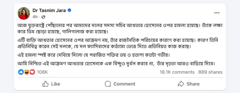 তিনি আরও লিখেছেন, “এই হামলা স্পষ্ট করে দেখিয়ে দিলো যে পরাজিত শক্তির ভয় ও হতাশা কতটা গভীর। আমি নিশ্চিত এই আক্রমণ আখতার হোসেনকে এক বিন্দুও দুর্বল করবে না, তার দৃঢ়তা আরও বাড়িয়ে দিবে।”