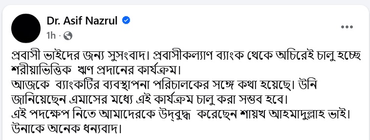 উপদেষ্টা আজ তার ভেরিফাইড ফেসবুক পেইজে এক পোস্টে বলেন, ‘প্রবাসী ভাইদের জন্য সুসংবাদ। প্রবাসীকল্যাণ ব্যাংক থেকে অচিরেই চালু হচ্ছে শরীয়াভিত্তিক ঋণ প্রদানের কার্যক্রম। আজকে ব্যাংকটির ব্যবস্থাপনা পরিচালকের সঙ্গে কথা হয়েছে। উনি জানিয়েছেন এ মাসের মধ্যে এই কার্যক্রম চালু করা সম্ভব হবে। এই পদক্ষেপ নিতে আমাদেরকে উদ্বুদ্ধ করেছেন শায়খ আহমাদুল্লাহ ভাই। উনাকে অনেক ধন্যবাদ।