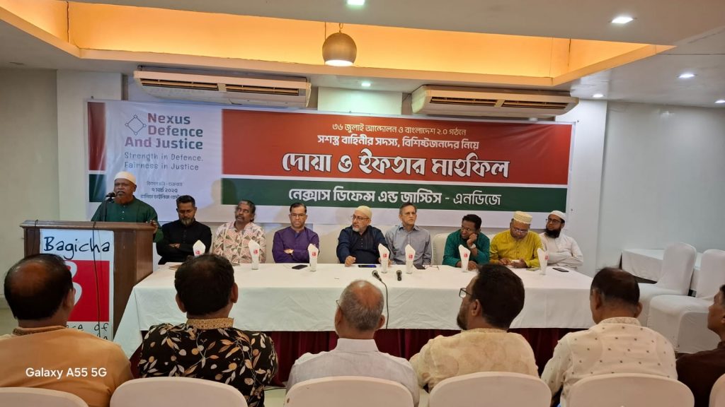 ৩৬ জুলাই আন্দোলন পরবর্তী নতুন বাংলাদেশ ২.০ গঠনের প্রয়োজনীয়তা এবং চ্যালেঞ্জের বিষয়ে আলোচনা এবং মত বিনিময় করে ‘নেক্সাস ডিফেন্স অ্যান্ড জাস্টিস’। উক্ত অনুষ্ঠানে জুলাই আন্দোলনে প্রত্যক্ষ এবং পরোক্ষভাবে অংশগ্রহণকারী অবসরপ্রাপ্ত সামরিক অফিসার, বিডিআর হত্যায় শহীদ পরিবার, গুম হত্যায় ক্ষতিগ্রস্ত এবং স্বৈরাচার আমলে বঞ্চিত ও চাকুরীচ্যুত অফিসারবৃন্দ, বিভিন্ন রাজনৈতিক দলের নেতৃবৃন্দ এবং সমাজের বিশিষ্ট ব্যক্তিবর্গ উপস্থিত ছিলেন।
