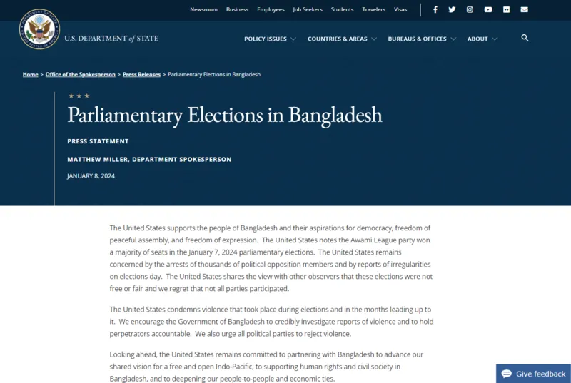 সোমবার যুক্তরাষ্ট্রের স্টেট ডিপার্টেমন্টের মুখপাত্র ম্যাথিউ মিলারের কার্যালয় থেকে ইস্যু করা বিবৃতির শিরোনাম ছিল ‘পার্লামেন্টারি ইলেকশনস ইন বাংলাদেশে’। প্রায় একই বক্তব্য নিয়ে মি. মিলার সামাজিক মাধ্যম এক্সেও (সাবেক টুইটার) একটি পোষ্ট দিয়েছেন।