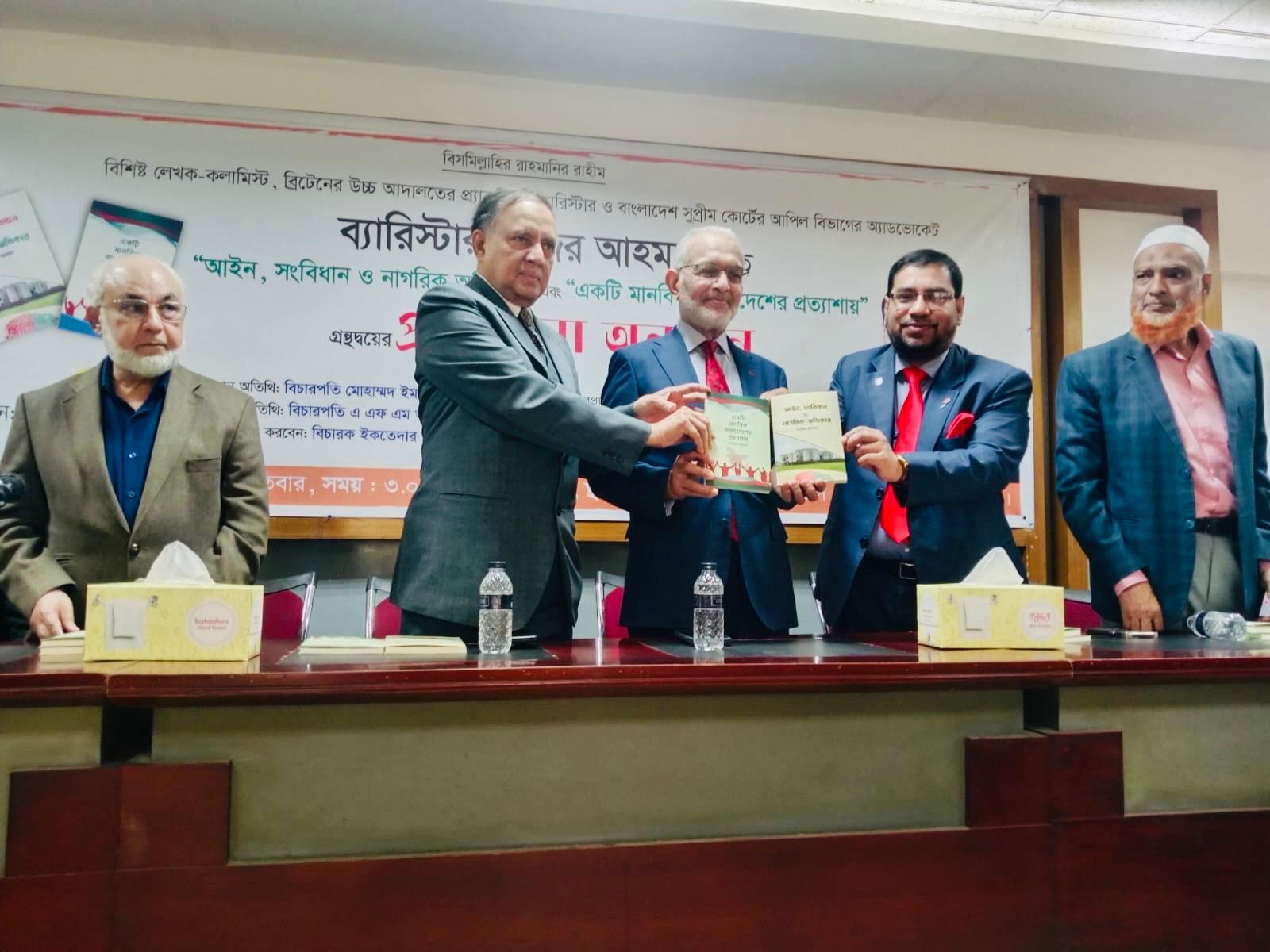 “আইন, সংবিধান ও নাগরিক অধিকার” ও “একটি মানবিক বাংলাদেশের প্রত্যাশায়” এর প্রকাশনা অনুষ্ঠানে সভাপতিত্ব করেন সাবেক জেলা ও দায়রা জজ এবং বাংলাদেশ সুপ্রিম কোর্টের সাবেক রেজিস্ট্রার জেনারেল বিচারক ইকতেদার আহমেদ। অনুষ্ঠানে প্রধান অতিথি হিসেবে উপস্থিত ছিলেন বাংলাদেশের সাবেক ভারপ্রাপ্ত প্রধান বিচারপতি মোহাম্মদ ইমান আলী ও বিশেষ অতিথি হিসেবে উপস্থিত ছিলেন বাংলাদেশ সুপ্রিম কোর্টের হাইকোর্ট বিভাগের সাবেক সিনিয়র বিচারপতি এএফএম আব্দুর রহমান।