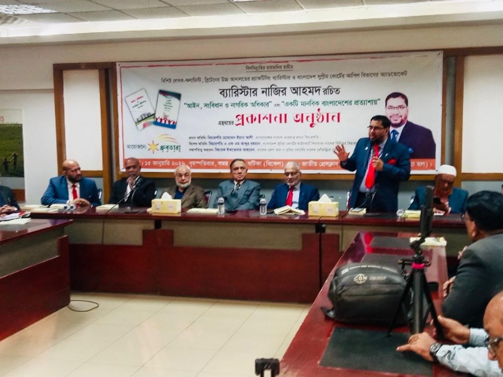 বৃহস্পতিবার বিকেলে জাতীয় প্রেসক্লাবের তফাজ্জল হোসেন মানিক মিয়া হলে ব্রিটেনের উচ্চ আদালতের প্র্যাকটিসিং ব্যারিস্টার, বিশিষ্ট লেখক ও সংবিধান বিশেষজ্ঞ, রাষ্ট্রচিন্তক, বাংলাদেশ সুপ্রীম কোর্টের আপিল বিভাগের আইনজীবী ও লন্ডন বারা অব নিউহ্যামের টানা তিনবারের সাবেক ডেপুটি স্পিকার ব্যারিস্টার নজির আহমদের লিখিত দুটি গ্রন্থের প্রকাশনা অনুষ্ঠানে মোড়ক উম্মোচনকালে প্রধান অতিথির বক্তব্যে বাংলাদেশের সাবেক ভারপ্রাপ্ত প্রধান বিচারপতি মোহাম্মদ ইমান আলী এসব কথা বলেন।