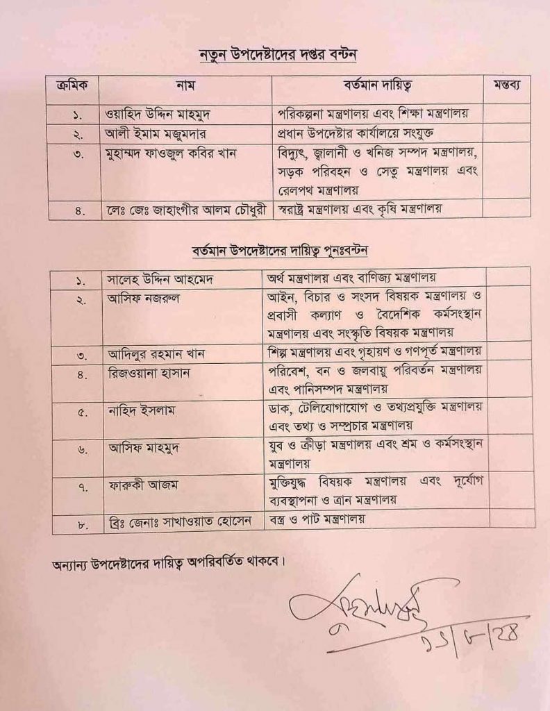 একই সঙ্গে বাড়তি দায়িত্ব হিসেবে অর্থ উপদেষ্টা সালেহ উদ্দিন আহমদকে বাণিজ্য মন্ত্রণালয়, আইন বিচার ও সংসদ বিষয়ক উপদেষ্টা আসিফ নজরুলকে প্রবাসী কল্যাণ ও বৈদেশিক কর্মসংস্থান ও সংস্কৃতি মন্ত্রণালয়, শিল্প উপদেষ্টা আদিলুর রহমান খানকে গৃহায়ণ ও গণপূর্ত মন্ত্রণালয়, পরিবেশ বন ও জলবায়ু পরিবর্তন উপদেষ্টা রিজওয়ানা হাসানকে পানিসম্পদ মন্ত্রণালয়, ডাক টেলিযোগাযোগ ও তথ্যপ্রযুক্তি উপদেষ্টা নাহিদ ইসলামকে তথ্য ও সম্প্রচার মন্ত্রণালয়, যুব ও ক্রীড়া উপদেষ্টা আসিফ মাহমুদকে শ্রম ও কর্মসংস্থান মন্ত্রণালয়, মুক্তিযুদ্ধ বিষয়ক উপদেষ্টা ফারুক-ই-আজমকে দুর্যোগ ব্যবস্থাপনা ও ত্রাণ মন্ত্রণালয়ের দায়িত্ব দেওয়া হয়েছে।