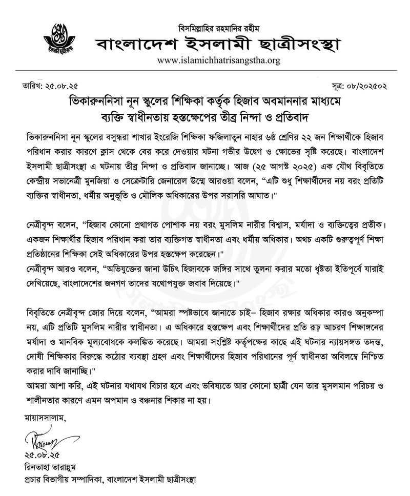 ভিকারুননিসা নূন স্কুলের বসুন্ধরা শাখার ইংরেজি শিক্ষিকা ফজিলাতুন নাহার ৬ষ্ঠ শ্রেণির ২২ জন শিক্ষার্থীকে হিজাব পরিধান করার কারণে ক্লাস থেকে বের করে দেওয়ার ঘটনা গভীর উদ্বেগ ও ক্ষোভের সৃষ্টি করেছে। বাংলাদেশ ইসলামী ছাত্রীসংস্থা এ ঘটনায় তীব্র নিন্দা ও প্রতিবাদ জানিয়েছে।