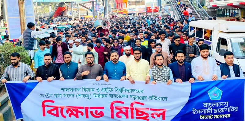 শাকসু নির্বাচন স্থগিতের প্রতিবাদে শিবিরের বিক্ষোভ মিছিলে সিলেটের রাজপথ মুখরিত