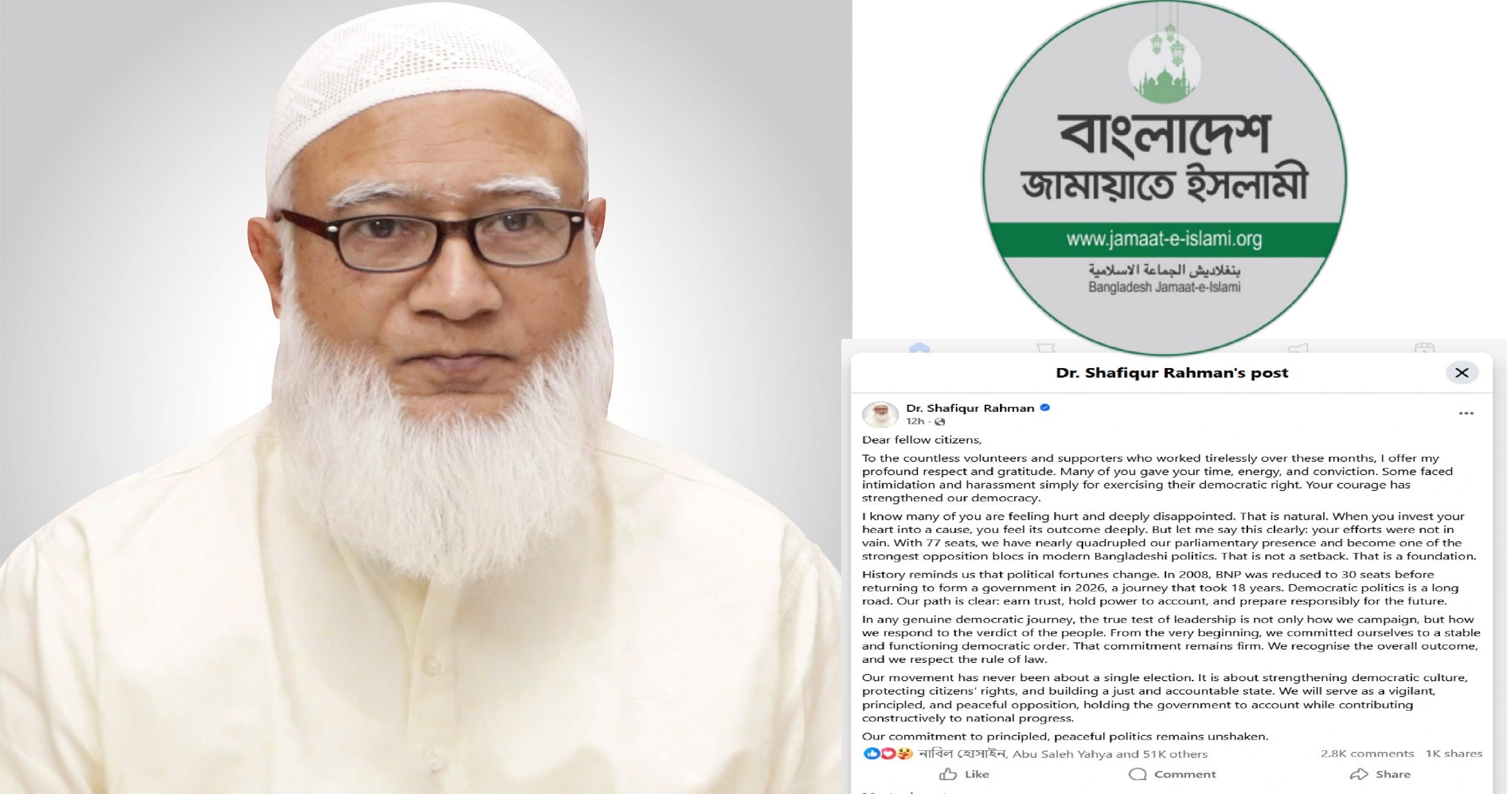 ত্রয়োদশ জাতীয় সংসদ নির্বাচনের ফলাফল মেনে নিয়ে দায়িত্বশীল বিরোধী দল হিসেবে কাজ করার ঘোষণা দিয়েছেন জামায়াতে ইসলামীর আমির ডা. শফিকুর রহমান। শুক্রবার (১৩ ফেব্রুয়ারি ২০২৬) দিবাগত রাত ১টা ৪৪ মিনেটে নিজের ভেরিফায়েড ফেসবুক পেজে পোস্ট দিয়ে এ ঘোষণা দেন তিনি। জামায়াত আমির লেখেন, ‘গত কয়েক মাসে অসংখ্য স্বেচ্ছাসেবক ও সমর্থক অক্লান্ত পরিশ্রম করেছেন, আপনাদের কৃতজ্ঞতা […]